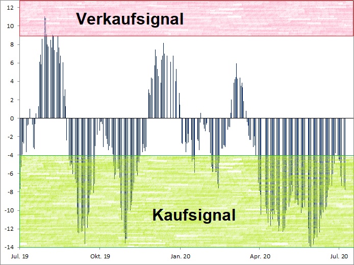 An der „Hebel Long“-Positionierung ändert sich erst einmal nichts. Der GDL-Indikator liegt bei 4 Punkten (Warnsignal bei einem Fall auf 2 oder weniger) und das Euwax Sentiment notiert mit minus 7,79 Punkten weiter in der Kaufzone, die ab einem Wert von minus 4 Punkten beginnt. Solange die Kurse weiter steigen, dürften die Voraussetzungen für „Hebel Long“ vorerst weiter bestehen bleiben.