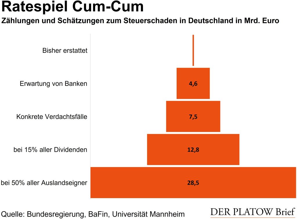 Niemand weiß, wie groß die Summen sind, die mittels Cum-Cum-Deals dem Fiskus vorenthalten wurden. Bisher hat der Staat 227 Mio. Euro erfolgreich zurückgefordert, wie die Bundesregierung im Juli festhielt. Der tatsächliche Steuerschaden geht vermutlich in die Milliarden, doch eine genaue Summe kennt niemand. Die Finanzaufsicht BaFin hat in einer umfassenden Abfrage unter Banken im Jahr 2021 eine erwartete finanzielle Last von 4,6 Mrd. Euro ermittelt, die Banken aufgrund möglicher Steuerrückforderungen erwarten. Aktuell läuft eine neue Abfrage der BaFin. Derweil zählt die Bundesregierung für alle bekannten Verdachtsfälle eine potenzielle Summe von 7,5 Mrd. Euro.