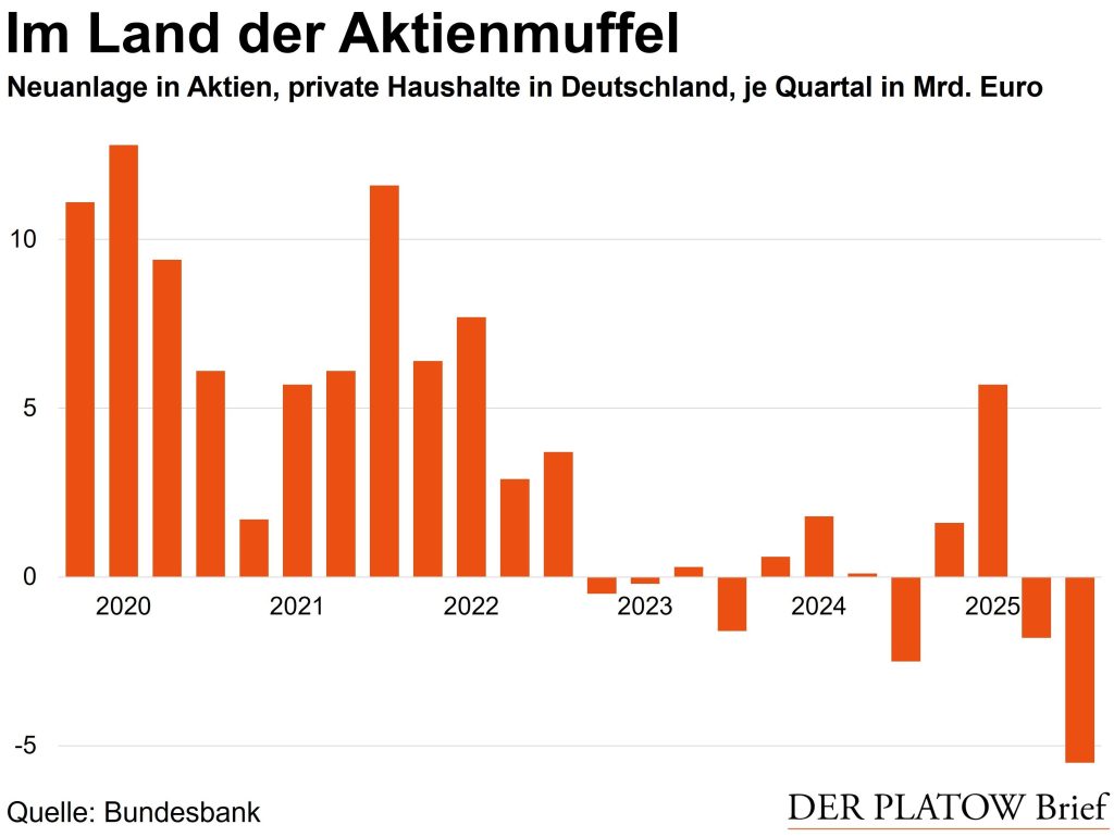 Doch neues Geld geben die Deutschen nur noch selten für börsennotierte Einzelaktien aus: Werden alle Käufe und Verkäufe gezählt, zogen sie im Schlussquartal 2025 insgesamt sogar 5,5 Mrd. Euro ab, wie neueste Zahlen der Bundesbank zeigen. Seit 2021 nimmt die Sparleistung in Einzelaktien kontinuierlich ab. Der letzte Abfluss in dieser Größenordnung liegt bereits mehr als ein Jahrzehnt zurück.