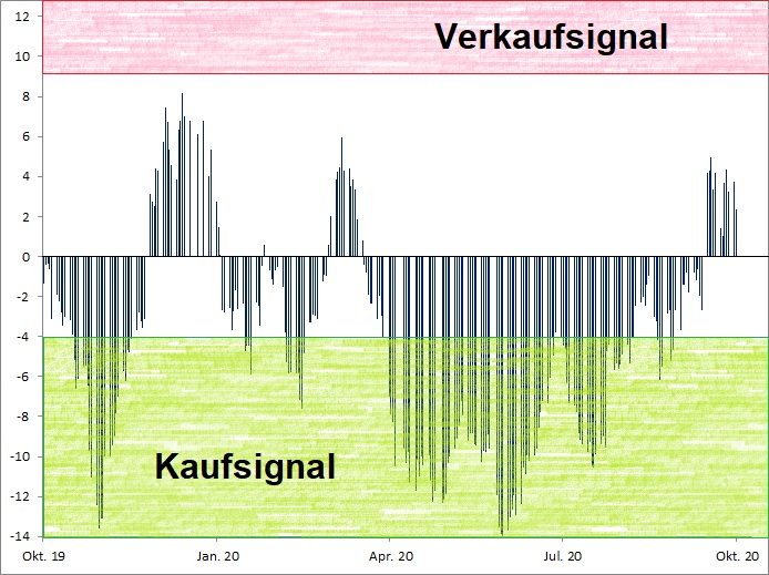Das führt dazu, dass es bei einem nachhaltigen Abdriften des Marktes gen Süden zeitnah zu einem Verkaufssignal des GDL-Indikators kommen dürfte. Natürlich kann das dann wie immer auch ein Fehlsignal werden und es kann bei einer erneuten Seitwärtsbewegung wieder zu häufigen Umschichtungen kommen. Wenn aber der Markt nach unten durchrauscht, bleiben wir davon – wie schon im Frühjahr – erst einmal verschont. Mit Blick auf die Risiken im Falle eines echten Crashs ist das auf jeden Fall eine gute Nachricht. Bei einer Auflösung der Konsolidierung nach oben sind wir ohnehin mit dabei. Das Euwax Sentiment bewegt sich mit aktuell plus 2,37 Punkten mitten in der neutralen Zone, sodass von dieser Seite aus kurzfristig nicht mit einem neuen Signal zu rechnen ist.