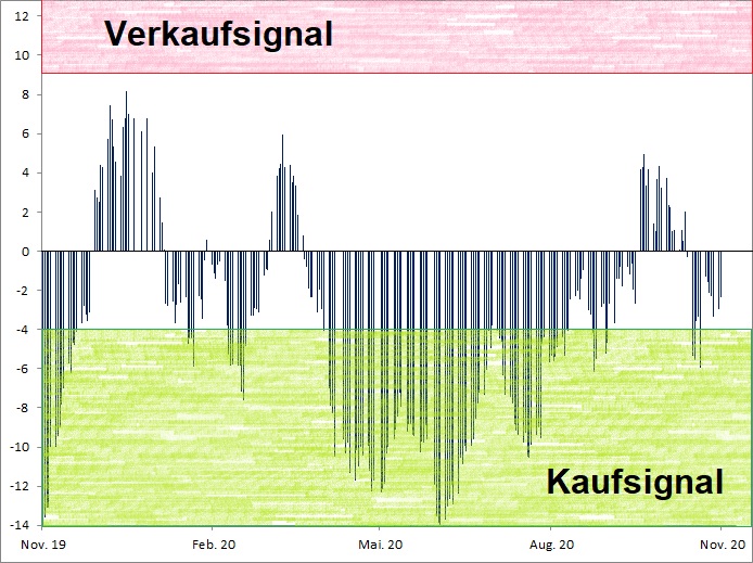 Zu einem Wechsel auf „einfach Long“ würde es alternativ auch dann kommen, wenn das Euwax Sentiment wieder unter die Marke von minus vier Punkten rutscht. Aktuell sehen wir hier einen Wert von minus 2,38 Punkten. Deshalb bleiben wir zunächst weiter an der Seitenlinie, auf die wir am Dienstag der vergangenen Woche bei einem DAX-Stand von ca. 12200 Punkten gewechselt waren.