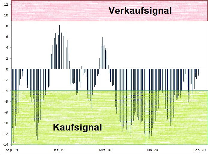Das für die Positionierung mitentscheidende Euwax Sentiment notiert aktuell bei minus 0,64 Punkten und damit weiterhin unterhalb der Nullmarke. Einen Wert darüber gab es zuletzt vor knapp sechs Monaten. Damals stand der DAX bei etwa 9000 Punkten. Der anschließende Anstieg wurde also wie üblich von einer großen Skepsis der Privatanleger begleitet. Das Ende der lange Zeit sehr wichtigen „Flat“-Phase in unseren wikifolios erfolgte allerdings erst rund zwei Wochen später bei einem DAX-Niveau von ca. 9900 Punkten. Den ersten Teil der Erholung haben wir daher verpasst. Allerdings hatten wir vorher auch den Großteil des Einbruchs umgehen können.
