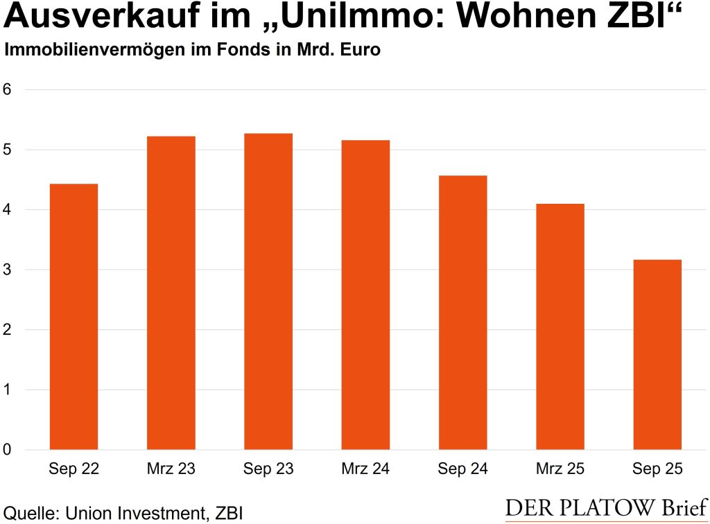 Bereits zuvor war uns ein Massenverkauf im Winterhalbjahr aufgefallen. Die Geschwindigkeit der Verkäufe nahm im Sommer aber noch einmal deutlich zu. Von Anfang April bis Ende September 2025 verkaufte das Fondsmanagement 333 Objekte im Wert von 1,08 Mrd. Euro. Das ist etwa doppelt so viel Geld wie im Halbjahr zuvor. Die verantwortliche Union Investment-Tochter ZBI verkaufte zum Beispiel im Juni zahlreiche Wohnhäuser in Hannover, Güstrow und Iserlohn und im August in Chemnitz, Zwickau, Dresden und Berlin. Nur vereinzelt kaufte sie im Gegenzug Objekte zu.