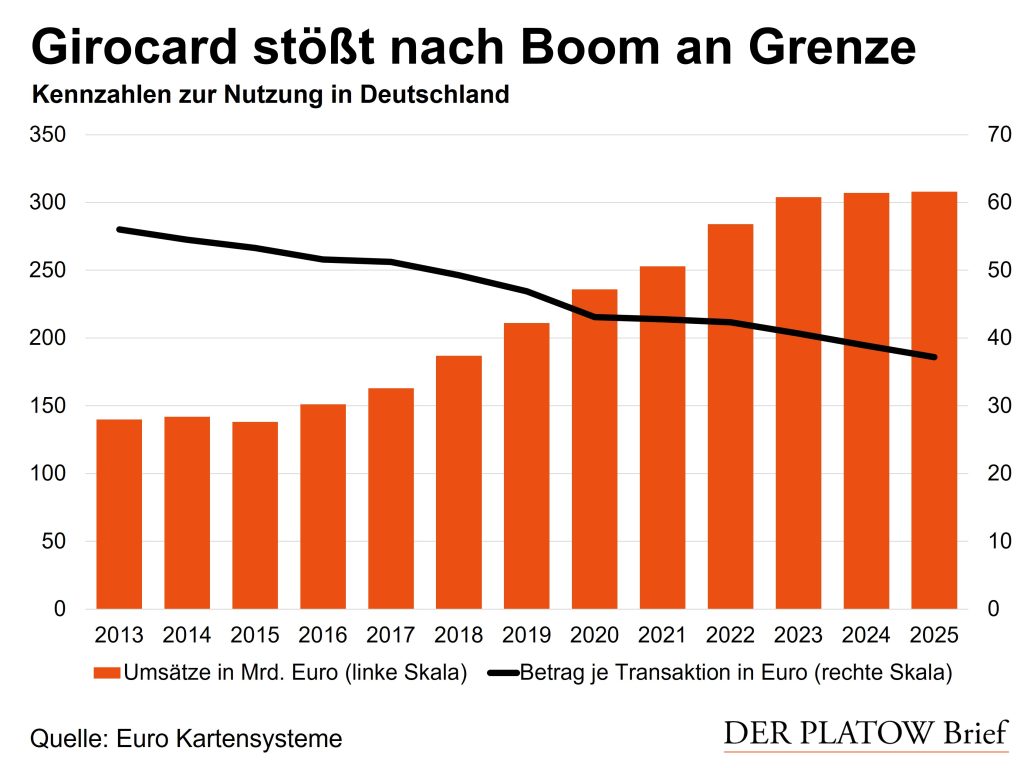 Die US-Kartenriesen profitieren dabei von der vorhandenen Infrastruktur. Die Zahl der Terminals ist auf zuletzt 1,3 Mio. gewachsen. Davon lebt die Girocard, aber auch ihre Konkurrenz. Der umsatzbezogene Marktanteil der Girocard an allen Debitkarten lag laut Bundesbank Ende 2024 zwar noch bei beachtlichen 72%, doch war der Wert zuvor binnen zwei Jahren um 7 Prozentpunkte gefallen.