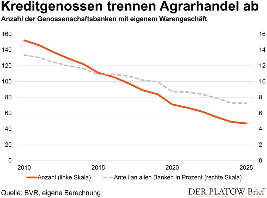 Seit Ende 2010 fiel die Zahl der Banken mit Warengeschäft – typischerweise mit Agrarbezug – von damals 152 auf zuletzt 47, wie BVR-Daten zeigen. Auch relativ zur Gesamtzahl aller Kreditgenossenschaften nimmt der Anteil ab. Führten vor eineinhalb Jahrzehnten noch 13% aller Volks- und Raiffeisenbanken ein Warengeschäft im eigenen Haus, sind es heute nur noch 7%.