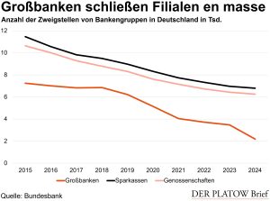 Der Abbau des Filialnetzes kommt in Wellen. Besonders drastisch fällt die Entscheidung der Postbank von Anfang 2024 ins Gewicht, sich von rund 1.800 sogenannten Partnerfilialen zu trennen, also dem Angebot von Bankfunktionen in Supermärkten und Läden. Der Abbau startete im vergangenen Jahr und läuft bis Ende dieses Jahres. Hinzu kommt ein Abbau regulärer Filialen, und zwar von 550 im Oktober 2023 auf 320 bis Mitte 2026. Die Commerzbank wiederum kündigte im November 2021 den Abbau des Filialnetzes von damals 790 auf 450 an, ehe sie das Ziel weiter auf heute 400 verschärfte. Auch die Deutsche Bank selbst und die HypoVereinsbank haben in den vergangenen Jahren viele Standorte geschlossen.