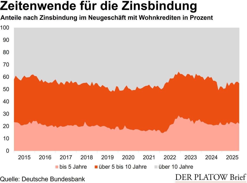 Kredite mit langer Zinsbindung von mehr als zehn Jahren machten im Neugeschäft bis ins Jahr 2022 hinein annähernd die Hälfte aller Darlehen aus, in Spitzenmonaten sogar 52%. Danach ist der Anteil auf bis zu 37% abgestürzt, ehe er sich auf zuletzt 45% im November 2025 erholte.
