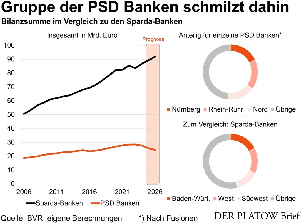 Die Gruppe der PSD Banken schrumpft und schrumpft: 27,7 Mrd. Euro brachte sie Ende 2024 auf die Waage, doch zwei Abgänge lassen die Gruppe absehbar weiter schmelzen: Die BBBank hat die PSD Bank Berlin-Brandenburg mit einer Bilanzsumme von 2,5 Mrd. Euro bereits geschluckt und übernimmt absehbar auch die PSD Bank Hessen-Thüringen mit 1,6 Mrd. Euro. Damit wird die gesamte Gruppe kaum größer als die BBBank selbst sein, die nach beiden Übernahmen auf rund 24 Mrd. Euro kommen wird. Auch die größte Volksbank, die Frankfurter Volksbank mit zuletzt 19,6 Mrd. Euro, wäre nicht mehr weit vom Gewicht der gesamten Bankengruppe der einstigen Post-Spar- und Darlehnsvereine entfernt.