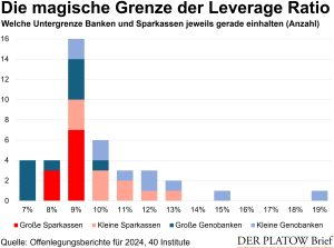 Insgesamt sind kleine Geldhäuser mit einer Bilanzsumme um 1 Mrd. Euro besser kapitalisiert: Eine Leverage Ratio von 10% und mehr ist hier üblich. Die Volksbank Staufen schießt mit einer Leverage Ratio von 19,6% den Vogel ab. Die Raiffeisenbank Südstormarn Mölln kommt auf beachtliche 15,2%. Von einer Erleichterung könnten also wie erhofft gerade sehr kleine Adressen profitieren.