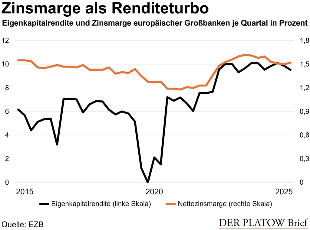 Europas Großbanken schreiben so hohe Gewinne wie lange nicht mehr. Die Eigenkapitalrenditen sprangen nach Angaben der Zentralbanker mit der Zinswende deutlich nach oben, und zwar von unter 7% im Startquartal 2022 auf über 10% im zweiten Jahresviertel 2023. Seither sind Werte nahe 10% üblich. Schon vor der Zinswende hatten sich die Renditen vom anfänglichen Corona-Schock kräftig erholt.