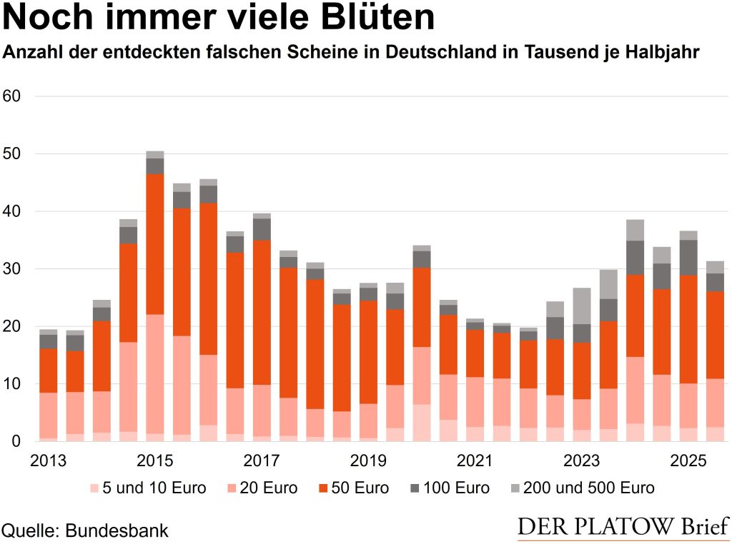 Die Daten der Bundesbank vermitteln jedoch einen falschen Eindruck über die kriminelle Energie der Fälscher. So haben Ermittler in 18 Ländern Falschgeld mit einem angeblichen Wert von sage und schreibe 1,2 Mrd. Euro beschlagnahmt, wie die europäische Polizeibehörde Europol vor wenigen Tagen offenlegte. Die Ermittler fanden von Juni bis November 2025 in 379 Fällen falsche Scheine. In der Notenbank-Statistik tauchen Fälschungen aber nur dann auf, wenn sie bereits in Umlauf waren.