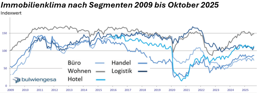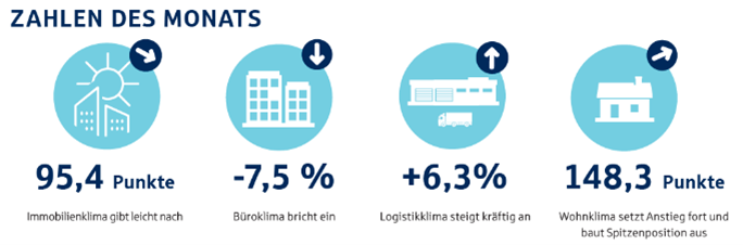 Für andere Immobilienklassen ist die Stimmung besser: Das Logistikklima stieg um 6,3 % auf 109,1 Punkte. Das Hotelklima legte um 3,7% auf 112,5 Punkte zu. An der Spitze bleibt das Wohnklima mit +0,6 % und 148,3 Punkten. Die Stimmung bei Handelsobjekten hellte sich leicht auf und stieg um 0,5 Punkte auf 86,6.