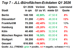 Obwohl die Büronutzung mit den Bewertungs- und Investmentkonsequenzen der Zinswende in der derzeit stark leidenden Immobilienwirtschaft nichts zu tun hat, kommt jetzt auch noch der Ausfall einer konjunkturell stabilen Nachfrage hinzu. Es bleibt trostlos. Die drei Analysen von BNP Paribas Real Estate (BNPPRE), CBRE und JLL zeichnen ein konsistentes Bild eines schwachen ersten Quartals 2026. Die Spreizung mit stabilen bis steigenden Mieten im Top-Segment und Schwächen im normalen Markt setzt sich fort. Die klassische Arbitrage, bei teuren Spitzenmieten auf günstigere Flächen oder Standorte auszuweichen, scheint erstmals in der Historie der Büromärkte ausgesetzt. Während gesuchte moderne Top-Flächen knapp bleiben, steigen generell die Leerstände. München und Berlin sorgen zusammen für die Hälfte des Flächenumsatzes der sieben Büro-Metropolen. Das Auftaktquartal 2026 ist umsatzgleich mit dem ersten Quartal 2013 und das schwächste erste Quartal seit 2009.