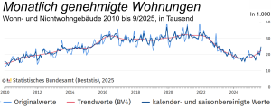 Aus wohnungspolitischer Sicht sind die Mehrfamilienhäuser am interessantesten. Hier genehmigten die Bauaufsichtsbehörden 93.100 Neubauwohnungen. Das war ein Anstieg um 13% bzw. 10.700 Wohnungen. Als Umbaumaßnahme in bestehenden Wohn- und Nichtwohngebäuden wurden von Januar bis September 2025 insgesamt 29.900 Wohnungen genehmigt (+3,9%).