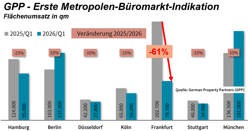 Im Vorjahr hatte Frankfurt noch von Großabschlüssen wie Commerzbank und ING profitiert, die zusammen über 100.000 qm auf sich vereinten. Diesmal blieb als einziger großer Deal der Eigennutzerkauf der DZ Bank mit knapp 21.000 qm. Dahinter folgen Westbridge mit 4.400 qm und ein Bildungsunternehmen mit 2.700 qm – weit entfernt von der 5.000‑qm‑Marke. Der Durchschnitt der vergangenen zehn Startquartale von 109.500 qm wurde damit um mehr als 40% verfehlt. Das Startquartal 2025 sei allerdings außergewöhnlich stark gewesen, betonen die Makler.