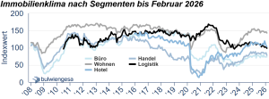 Lediglich das Büroklima bleibt stabiles Schlusslicht. Im Februar schalten alle Segmente mit Ausnahme des Büroklimas in den Rückwärtsgang. Das Handelsklima verzeichnet mit einem Minus von 8,3 % den stärksten Rückgang und liegt nun bei 78,1 Punkten. Das Logistikklima fällt erstmals seit über zwei Jahren wieder unter die 100 Punkte‑Marke, verliert 4,1 % und notiert bei 98,6 Punkten. Auch das Wohnklima gibt nach, behauptet aber mit 142,9 Punkten (-2,2 %) weiterhin deutlich die Spitzenposition. Das Hotelklima verliert ebenfalls leicht und steht nach einem Rückgang von 2,4 % bei 103,3 Punkten – und damit wieder vor dem Logistikklima. Das Büroklima hält sich bei miesen 73,6 Punkten.