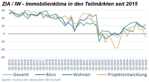 Weitere Vorschläge zur Verschärfung von Mietpreisregulierungen kämen jetzt gerade zur Unzeit, kommentiert Schöberl die zentralen Ergebnisse der Umfrage des Instituts der deutschen Wirtschaft (IW) im Auftrag des ZIA. Die Bewertung der aktuellen Geschäftslage steigt leicht um 1,7 Punkte auf 14,5. Allerdings sinken die Erwartungen deutlicher um 3,7 Punkte auf 16,4. Das Gesamtklima verschlechtert sich um 1,0 Punkte gegenüber dem 4. Quartal 2025 und liegt nun fast 10 Punkte unter dem Wert des Sommers 2025. Während der Büromarkt robust geblieben sei, hätten die aktuellen geopolitischen und wirtschaftlichen Herausforderungen insbesondere Wohnimmobilien und Projektentwicklung stark betroffen.
