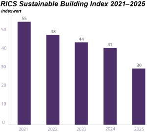 Der RICS Sustainable Building Index (SBI) fiel allein 2025 global von +41 auf +30. Seit fünf Jahren geht es bergab (2021: +55; 2022: +48; 2023: +44; 2024: +41; 2025: +30). Als Ursachen für den Rückgang nennt RICS wirtschaftliche Unsicherheiten, uneinheitliche politische Rahmenbedingungen, gestiegene Baukosten sowie ein Defizit an eindeutigen Richtlinien und Definitionen für nachhaltige Gebäude. Weltweit gaben 46% der Befragten an, CO₂-Emissionen in Bauprojekten gar nicht erst zu messen.
