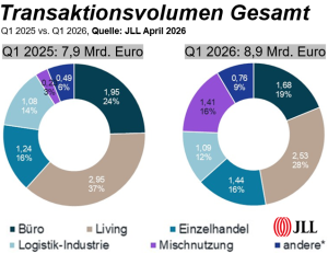 JLL und BNPPRE zeichnen für das Auftaktquartal 2026 ein insgesamt vorsichtig positives Bild des deutschen Investmentmarkts. Das Volumen liegt mit 8,9 Mrd. Euro bei JLL bzw. gut 8,8 Mrd. Euro bei BNPPRE leicht über Vorjahr. Beide Häuser sehen eine Belebung. Allerdings verweisen die Researcher darauf, dass die Nahost-Krise, steigende Energiepreise, Inflationssorgen und höhere Finanzierungskosten das weitere Jahr wieder komplizierter machen können.