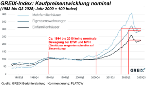 Eine Chance besteht im Wohnsegment aber darin, dass für Büro gefährliche Wellen wie Homeoffice und KI für Wohnen durchaus positiv sein können. Gleichzeitig wird die klassische PLATOW-Unterscheidung zwischen zinsgetriebenen Immobilien der institutionellen Kapitalanlage und Selbstnutzerimmobilien in der GREIX-Entwicklung deutlich. Vor über drei Jahren rechneten wir Ihnen bereits eine zu erwartende Korrektur der zinsabhängigen Multiplikatoren von 25 bis 35% vor, die durch Mietentwicklungen im Preis gedämpft wurde.