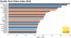 Savills analysierte in 100 Städten weltweit das geschäftliche und technologische Umfeld, die Dynamik und Attraktivität, den Talentpool sowie die Stärke und Tiefe verschiedener technologischer Teilsektoren. Der seit 2015 erhobene Tech Cities-Index zeige, dass die bestplatzierten Standorte zugleich Schwerpunkte für Risikokapital, vielfältige Technologiespezialisierungen und weltweit führende Universitäten sind. Nordamerikanische Städte stellen dabei die Hälfte der zehn führenden Tech Cities und 40% der 30 bestplatzierten Städte.