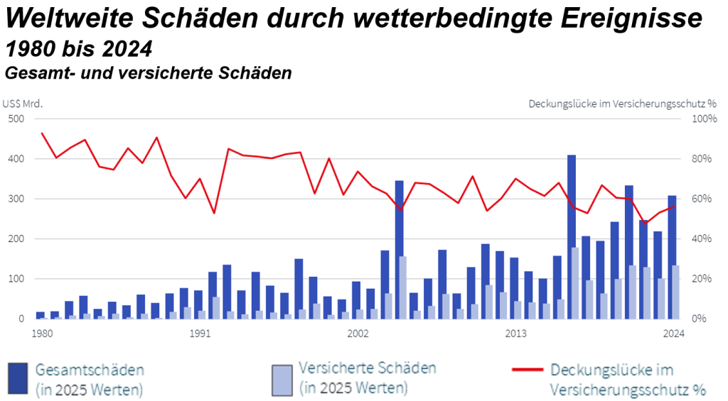 Extremwetter belasten längst die gesamte Volkswirtschaft. Im ersten Halbjahr 2025 summierten sich die weltweiten Schäden durch Naturkatastrophen auf 131 Mrd. Dollar – der zweithöchste Wert seit Beginn der Erhebung 1980. Knapp 90% entfielen auf Extremwettereignisse wie Stürme, Hagel und Überschwemmungen. Rund 60% der Schäden waren jedoch nicht versichert.