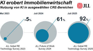 KI erobert laut einer aktuellen JLL-Studie die Immobilienwelt in Rekordgeschwindigkeit. Experimentierten vor zwei Jahren lediglich 5% der weltweit befragten Immobilienentscheider mit KI, haben im Jahr 2025 bereits 92% KI-Anwendungen implementiert oder planen dies noch in diesem Jahr. In Deutschland liegt die Quote sogar bei 93%. Das zeigt der aktuelle „Global Real Estate Technology Survey 2025″ von JLL, für den mehr als 1.000 Verantwortliche für das Corporate Real Estate Management in 16 Märkten befragt wurden, darunter 81 aus Deutschland. Zusätzlich nahmen weltweit etwa 500 Immobilieninvestoren aus 15 Märkten an der Befragung teil, davon 40 aus Deutschland.