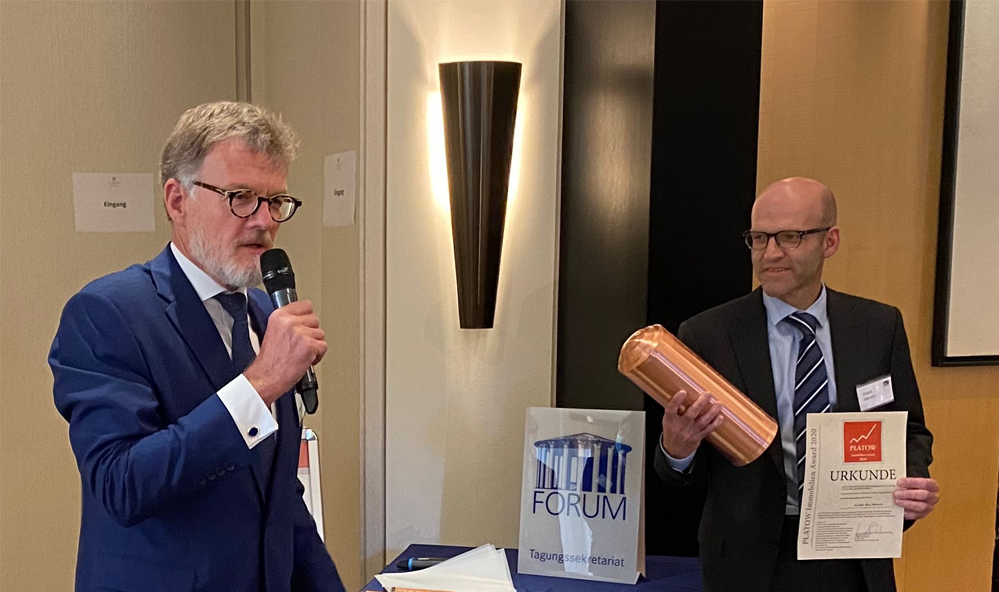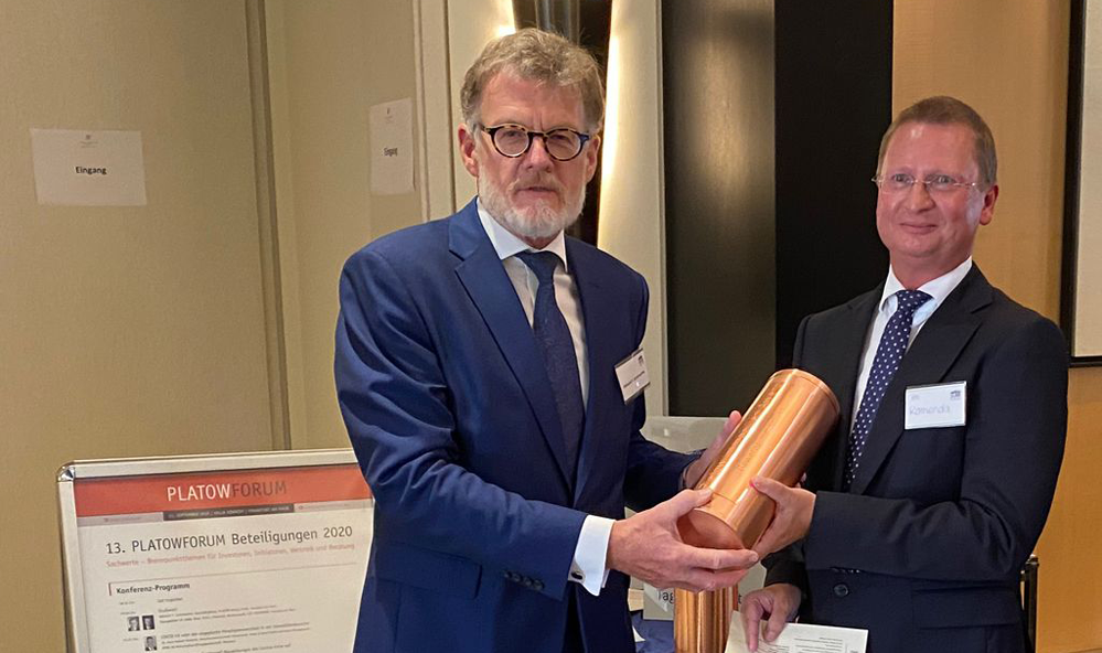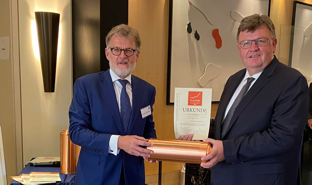 Zum achten Mal hat DER PLATOW Brief den PLATOW Immobilien Award verliehen. In insgesamt vier Kategorien, „Wohnen“, „Beteiligungen“, „Gewerbeimmobilien“, und „Sonder-immobilien“, erhielten die Preisträger von PLATOW-Geschäftsführer Albrecht F. Schirmacher die kupfernen Zeitkapseln überreicht. Werner Rohmert, Immobilienexperte und Autor für DER PLATOW Brief, moderierte die Preisübergabe im Rahmen der Konferenz „PLATOWFORUM Beteiligungen 2020“ im Frankfurter Hotel Villa Kennedy.